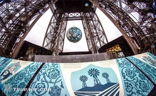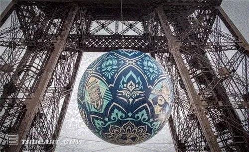 在巴黎市政府和Itinerrance画廊的支持下,著名街头艺术家谢泼德·费尔雷(Shepard Fairey) 创作了“地球危机(Earth Crisis)”球。这一巨型球体直径8米,重达2吨,悬挂在巴黎埃菲尔铁塔的一层和二层之间。仔细看,会看到上面绘有一些讽刺标语,比如“为无限的未来准备的石油”或“把它涂成黑色”。