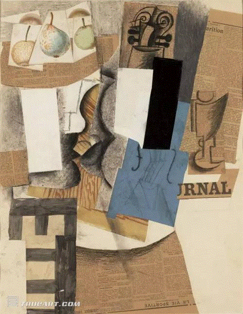 毕加索的立体主义拼贴画《有水果、小提琴和红酒杯的果盘》