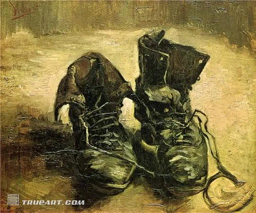 要是我们只是一般地把一双农鞋设置为对象,或只是在图像中观照这双摆在那里的空空的无人使用的鞋,我们就水远不会了解真正的器具之器具因素。从凡·高的画上,我们甚至无法辨认这双鞋是放在什么地方的。除了一个不确定的空间外,这双农鞋周围没有任何东西,也不清楚它们属于谁。鞋子上甚至连地里的土块或田野上的泥浆也没有粘带一点,这些东西本可以多少为我们暗示它们的用途的。只是一双农鞋,再无别的。然而——