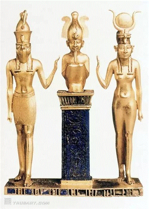 这个小胸饰上有几个黄金铸像,是利比亚时期(约公元前1069 -前71 5年)金属制品的优秀典范,来自第22王朝。奥西里斯神)蹲坐于中间的青金石圆柱上,两边是妻子伊西丝及儿子荷鲁斯。