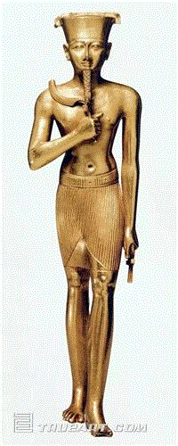 有些学者认为这件作品属于第1 8王朝末或第1 9王朝初(公元前1 4世纪末---公元前1 3世纪初),但多数学者认为它属于利比亚时期的第22王朝,时间在公元前900年左右。左腿前迈,左臂悬垂,左手抓着象征“生命”的“安可”,右腿是静止的,臂膀弯曲,右手持镰月弯刀。