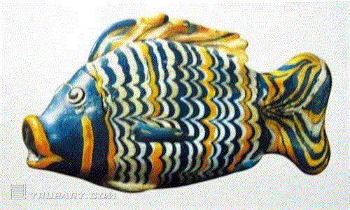 这条鱼长着鲜艳的条纹,可能是某种香水瓶。它由不透明玻璃制成,用了一种当时还很新的技术。把彩色玻璃条包在内坯上,熔在一起。随后,用一个金属探针做出花纹。