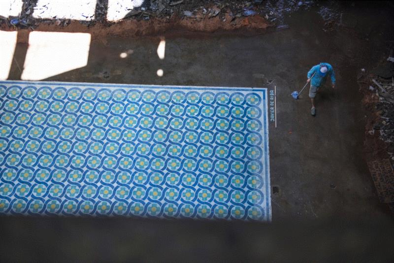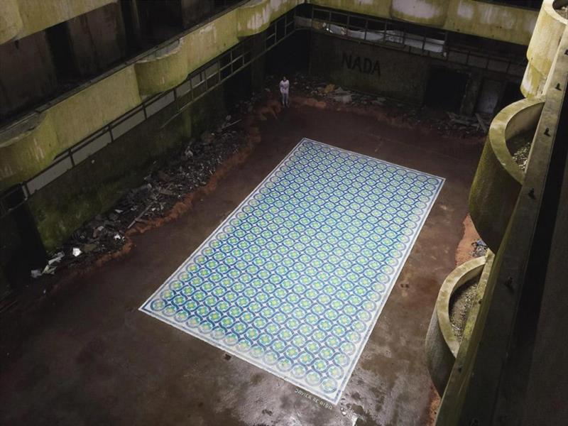 Javier de Riba是一位来自西班牙的视觉艺术家,是Reskate工作室的成员。自2011年,他在欧洲各地多次举办了展览,参与艺术节庆、工作坊、讲座等。他尝试通过在公共空间的艺术创作,来探索空间与物体的价值和意义。他擅长彩色油漆喷绘,但不是在纸上,而是喷绘在废弃的建筑、花园里。他的作品仿佛抹去原有空间的残破感,赋予其新的生命,从而改变了人们对这些物理空间的认知。其中,Floors系列最具代表性,如瓷砖一般的质感,使得无趣的表面充满了活力与故事。