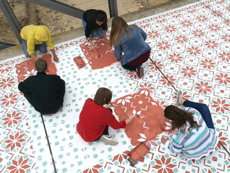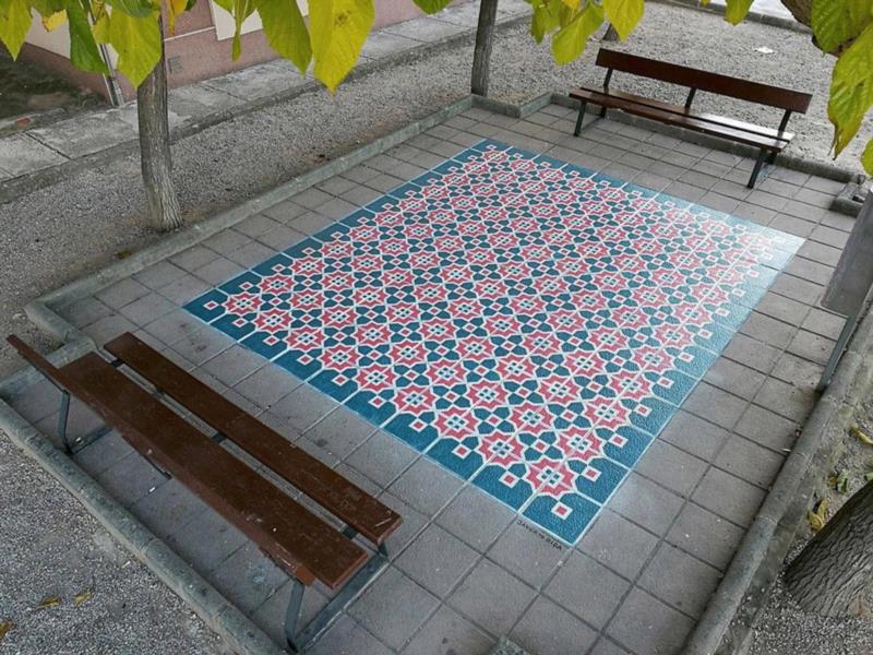 Javier以场地特点为灵感,用彩色油漆仿制瓷砖的质感进行创作。通过规则反复的图案美好,增加公共停车区域的家园感和安全感。