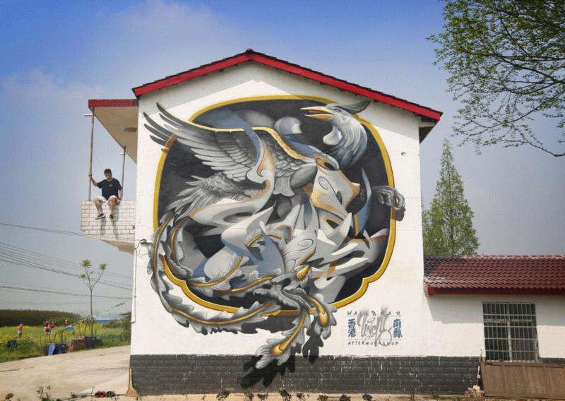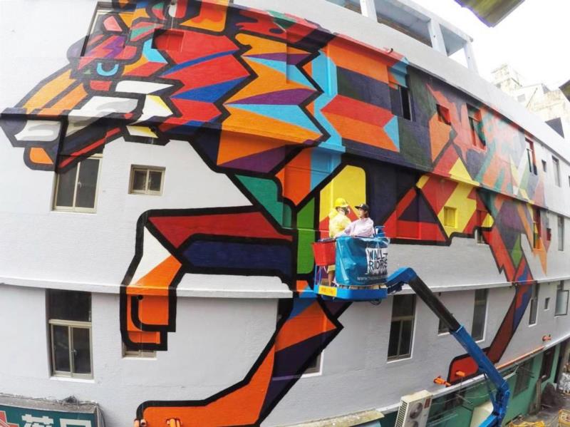 以墙面和地面为“画布”创作色彩鲜明的、具有几何图形风格的动物涂鸦。墙面的老鹰虎视眈眈,地面的老鼠四处躲藏。只有好好停车才可以帮助老鼠躲避老鹰的追捕和猎杀。