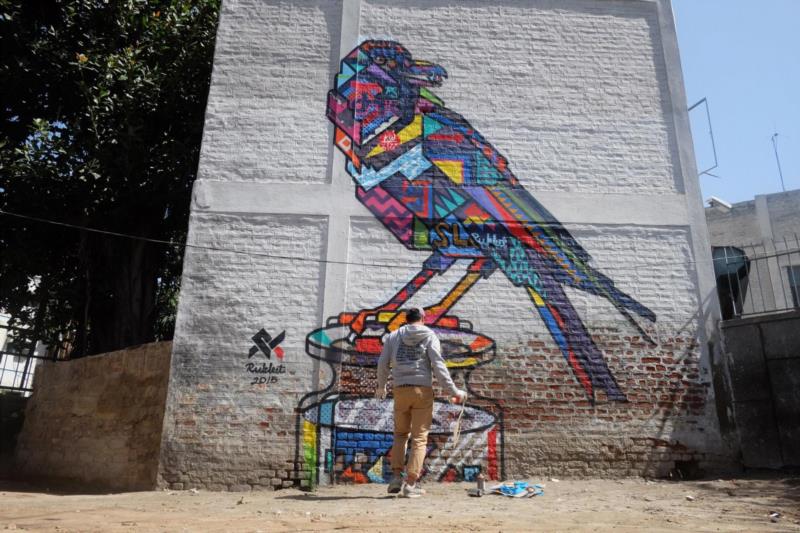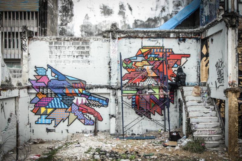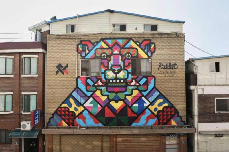 Rukkit Kuanhawate,平面设计师和街头艺术家,出生于泰国曼谷,毕业于朱拉隆大学的艺术教育专业。自2011年起开始在街头用模具作画,他倾向于用艳丽的色彩和规则的几何图形来诠释形象的作品,从街头的地面到拐角的墙面都是他展现自己的舞台。他曾经创作过一系列个性鲜明的动物主题壁画及艺术装置,使得街头涂鸦从平面走向立体。