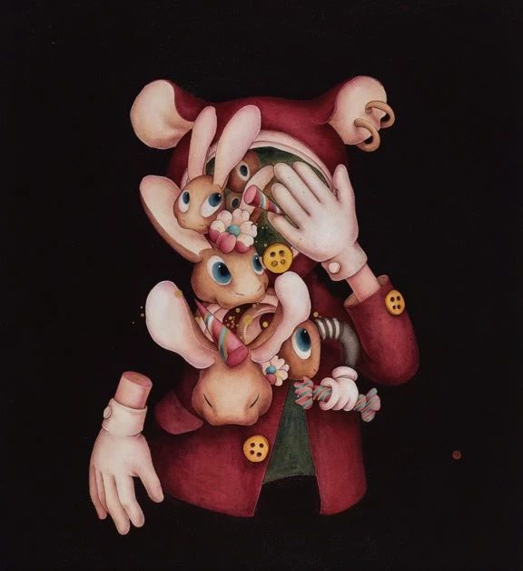 许峰表面上创作的是兔子形象,而本质上他是用兔子代替了人,对于人和社会的认识、态度借助兔子的形象表达出来,打开真实的内心需要勇气,而兔子就好比一张面具,更加容易被外界接受。