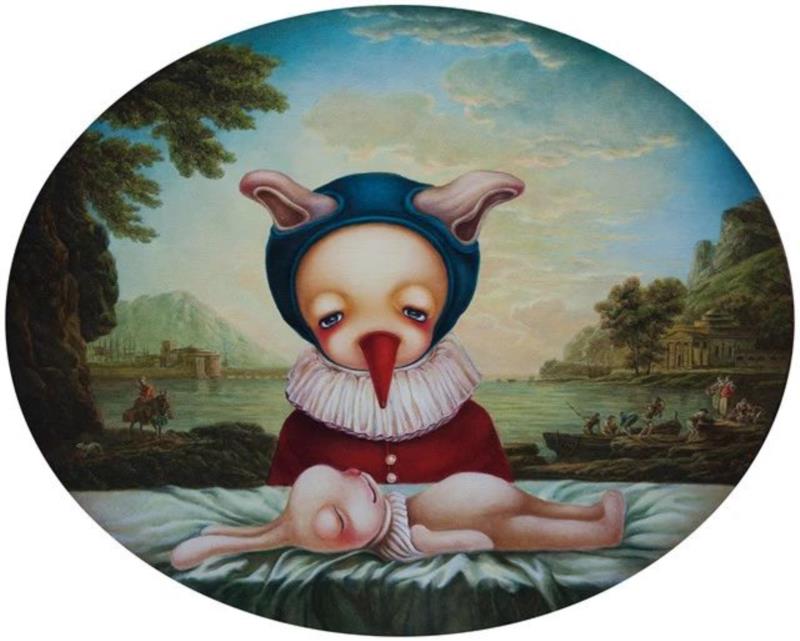 张静是一个感情丰富且对生活和处境极为敏感的艺术家,这也是一位优秀艺术家所必备的基本素养。在我看来,张静近年来的作品基本上是从个人成长经历中内心和情绪的演化,即第一阶段:从08年开始创作《我是一个小丑》系列,作品中充满了个性单纯的小丑形象,与她童年时期的记忆密不可分;第二阶段:《森林里的秘密》系列则是对自己青春期成长时的叛逆、成年后的忐忑以及感情失落后焦虑和内心矛盾的追问,因此作品中营造的是一个充满谎言的理想世界;第三阶段:《丢丢的马戏团》系列是记录成长的日记,即是在现实与理想的差距中磨砺了自身内心的强烈意志。就像张静自己描述的“我想在这个世界上的孤独是一样的,但向往的明媚却闪烁着不同的光芒。没有人真的知道幸福的样貌,我们用各自的方式描绘心里的蓝图”;第四阶段:《日常治疗》系列,即是通过日常记录的方式,去治愈和救赎内心遭受的创伤。“自我营造的幻象瞬时消失,阶段性的狂欢替代不了日常”的构想,是艺术家从创作形式和语言上更显得自由而随性。从绘画之初,张静在作品中就虚构了一个极具戏剧性的人物形象“丢丢”贯穿始终。眼角下垂,看起来忧伤而孤独的“丢丢”,无论是个体的造像,还是在不同场景当中扮演的各种角色,“丢丢”总是以一个性别模糊且近似小丑的形象,在亦真亦假的童话世界里向世人述说着现实社会中的所有遭遇。多年来张静勤学善思的探索,坚持不懈的创作,以自身的生命体验为创作蓝本,从而构建了她艺术创作的基调。同时,张静也沉迷在自己的创作之中,以自己虚构的童话世界作为精神的安乐园,试图寻求新的价值和理念。与其说这是一种自我的精神慰藉,倒不如说是对生命经验中某个阶段“心理创伤”的救赎和疗愈。