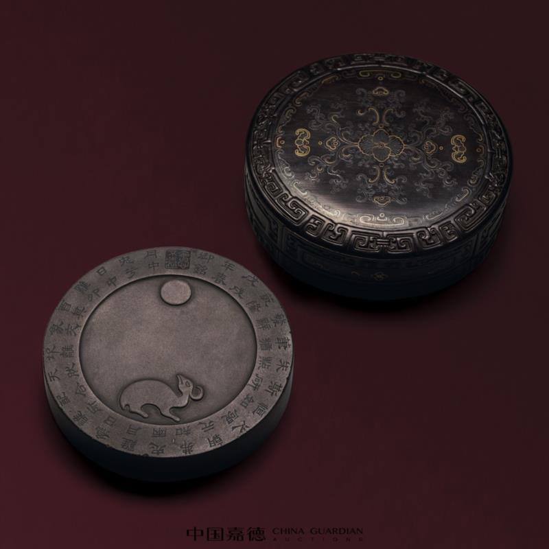 砚以端石制,呈圆形,砚面未分墨池、砚堂,通体打磨光素平坦,且周围起窄边砚唇。背面中央开圆形开光,减地浮雕“玉兔朝元”图,空中一轮圆月高悬,下方一只卧兔回首望天, 线条流畅,生动俏皮。开光周缘阴刻隶书御题砚铭:“月中兔兮日中鸡,卯酉其象交坎离。天然配合谁所为,日鸡月兔两弗知。朝元之砚恒如斯,砚朱点笔尤繁辞。乾隆戊戌年春御铭”并“会心不远”阳文篆书印款。“会心不远”为清代乾隆皇帝的一枚闲章印文,而本砚砚铭则作于乾隆四十三年(1778年),收录于《御制文二集·卷三十九》。砚侧以楷书阴刻“仿宋玉兔朝元砚”。配随形天地盖盒,盒盖四周铲地浮雕一圈拐龙纹,中央以错金银工艺绘饰缠枝花卉纹、蝠纹、如意云头纹,取“福寿绵延、生生不息”之鸿福寓意。盒底则以错银工艺绘饰折枝花卉纹。是砚简洁明快,洁净利落,质朴隽永。砚盒则满工满饰,构图繁而不乱,端雅华美。