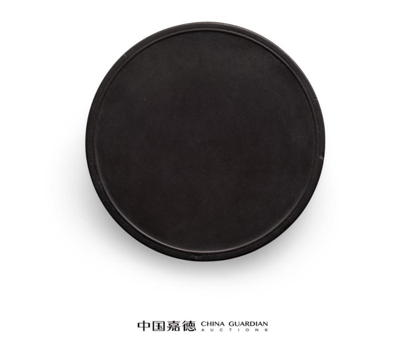 砚作圆形,直径11公分,高2.1公分,端石,材质精良,细润如肤,抚之即晕,呵之即湿,为优质老坑石材。砚面洁净无瑕,未开水池、砚堂,光素平坦,周雕窄边,砚体虽无雕饰但通体严整、爽利。
