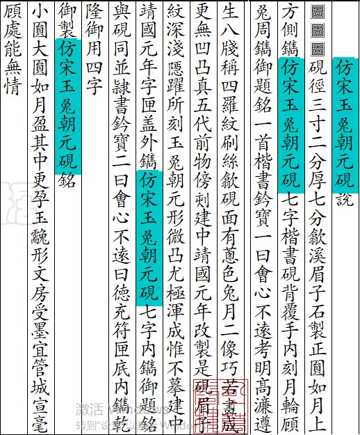 按,玉兔朝元砚一名源于文献记载,古人曾见过此类砚,称为五代遗物,明代高濂《遵生八笺》中提到所见此砚尚有宋建中靖国年款,清代乾隆年间加以仿制,故称“仿宋玉兔朝元砚”,并在乾隆年间编撰的《西清砚谱》中收录三件,质地又有歙石、澄泥,铭文内容有三种,其中之一与本文所举相同,但题刻为一周(本文所举为两周)。传世玉兔朝元砚均有一定艺术水平,本文所举之砚与砚谱收录略有不同,但制作精良,仍不失为乾隆时期佳作。
