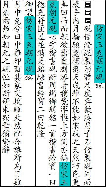 “玉兔朝元”砚台仿自宋代歙石“玉兔朝元”之砚,为清朝皇帝最喜仿制的六种古砚式之一。清代张英的《渊鉴类函》有描绘古砚实物的记载:“玉兔朝元砚,此为细罗纹刷丝歙石面有葱色,兔月二像巧若画成真,五代前物也。”“玉兔朝元”图也可视为玉兔在岁始对月亮的贺见,乃以玉兔比臣下,圆月比君王。