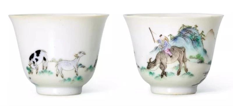 清道光粉彩牧童图杯一对《大清道光年制》款