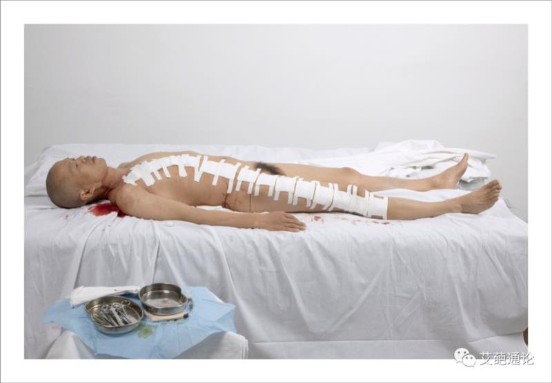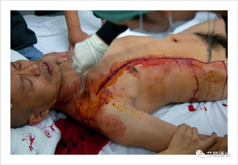 过程:何云昌以手术方式取出自己左边第8根肋骨,之后与母亲和几位女性朋友戴上肋骨制成的项圈分别合影。