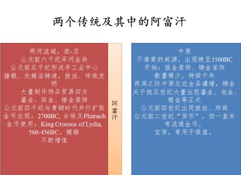 随着人和物品的流动,金加工技术传播开来。公元前第四千纪,以两河流域为中心,东到阿富汗,南到印度,西到太平洋,北到波罗的海,西南到尼罗河,在如此广袤的区域内,金都是重要宝藏,捶打工艺为其基本加工形式,并且在公元前六世纪,首先在马其顿帝国变成了货币,随即普及开来,且金币一直在升值。但在古代中国有所不同。