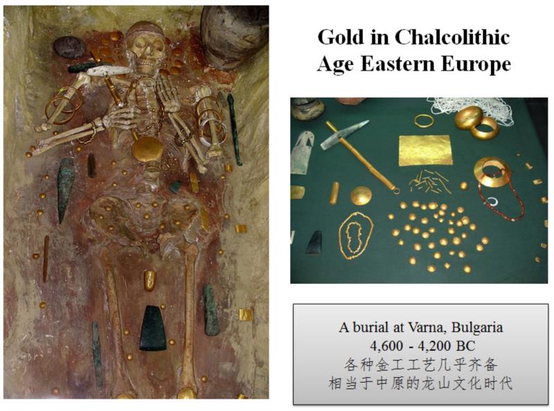 在欧洲的东边,保加利亚Varna发现的一个铜石并用时代的墓葬,约在公元前4200年前,随葬了大量金器,其制作工艺,基本上涵盖了此后所有的金加工技术。和阿富汗Tillya Tepe六号墓相比,年代在公元一世纪,虽然要晚四千多年,同样随葬了大量金器和金首饰,二者何其相似,可以作为近东和中亚长期崇拜金的证据。说明那时候的阿富汗文化,和两河流域及近东早期情形近似,二者有高度的继承性。阿富汗早期也出现过金器,出自Fullol的金杯约在公元前两千纪初,但未必属本地出产,而是从其他地方贸易而来,包括美索不达米亚。在那时的阿富汗,大量的青金石被开采贸易,应该获得了不菲的回报,向西的青金石贸易通道一直是畅通的。在阿富汗地区也曾发现若干金块,是否由青金石贸易所获,抑或当地采集,尚待探究。和它相紧邻的伊朗高原,大约在公元前4000年就已经出现了金工业,其发展几乎和两河流域同步。
