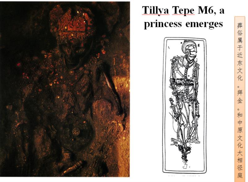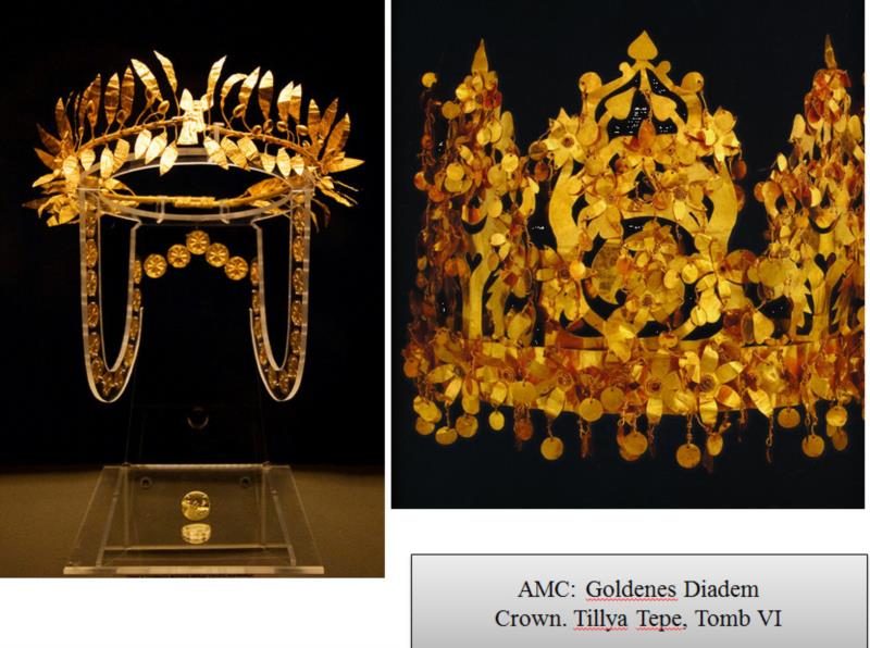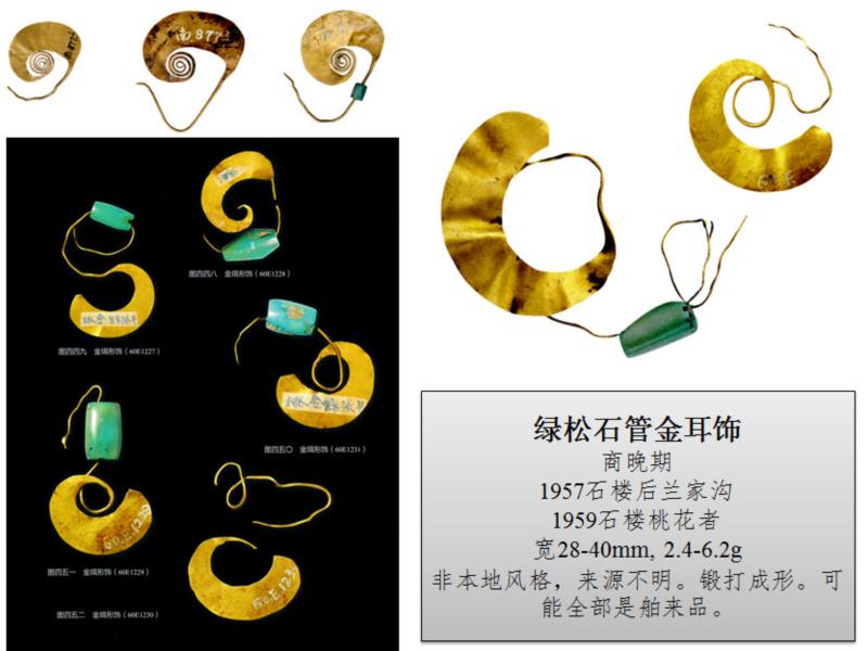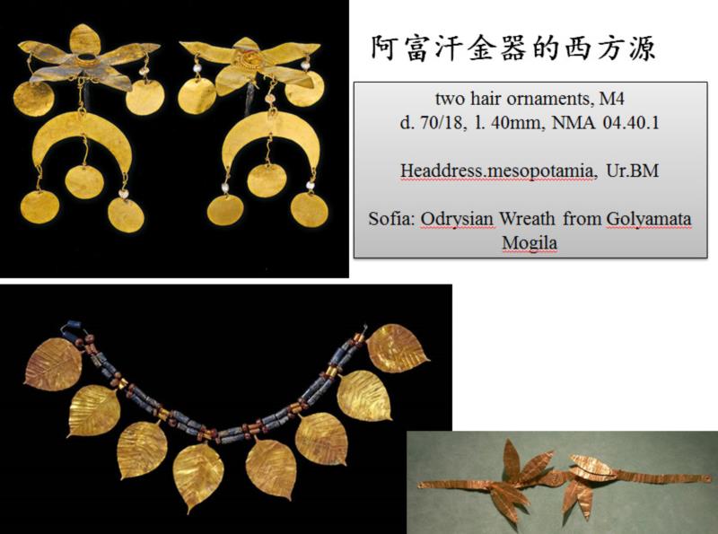 关于插金枝、垂金叶的冠饰,在中原出现很晚,基本上魏晋以后才出现,唐、辽、金盛行的。其渊源明显可上溯到两河流域,乌尔王冠和阿富汗所出金冠一脉相承。当然丝毫都没有中原的影响。而中原及长城地带的金冠,辗转受到阿富汗的影响是有很大可能,也是十分可行的。金首饰有类似现象。希腊和伊朗出土的金钏等,镶嵌有阿富汗的青金石,这类装饰和金饰品在中原是看不到的,但是在两河流域比比皆是,阿富汗也有相近之品。