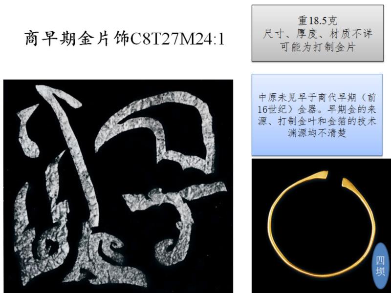 早期中原没有金崇拜,金出现晚而少。商早期开始的金饰品,除金箔打制外,金器均铸造,与青铜器一致,偶尔的打制金饰品未成气候。及至约公元前八世纪,中原形成金器传统,铸金为饰品。公元前五至前四世纪,西风再由草原传来,锻打金器和金叶、金箔并用之包金较多,鎏金兴起,错金银蔚为大观,形成新传统。在早期中国,经丝绸之路影响到中原金器极为有限且晚。同样,中原经草原和丝绸之路对中亚和近东的影响少而晚,中原金属艺术和技术未对中亚、近东产生影响。