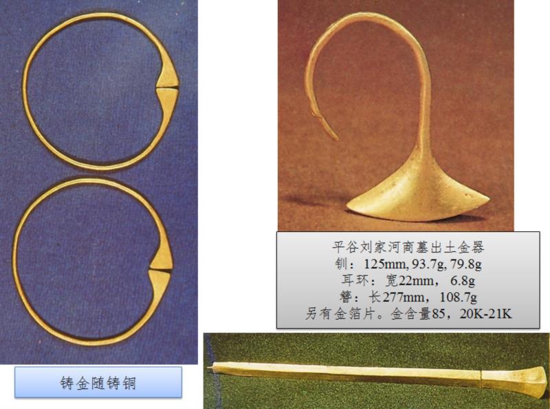 金在中国的起源尚不清楚,大概在公元前十六世纪前才出现。最初只是以金叶或金箔装饰器物,然后出现了铸造的金首饰,但颇零星,商和西周的金,总重不到一公斤。到了西周中期以后,中国的金器及其加工才形成传统,即是以铸造为主要加工方式,制作具有商周青铜器和玉器造型或纹饰的饰品或器物。发展到春秋晚期,金器及其加工工艺再次受到中亚的影响,出现了各种各样的加工工艺,锻与铸并行,并出现包金、鎏金、错金等等。而金在古代中国从来没有变成货币,汉以前也没有出现强烈的拜金现象。在物质文化上,东西文明对待金的差别如此强烈,是诱发我讨论其技术因素的重要动力。