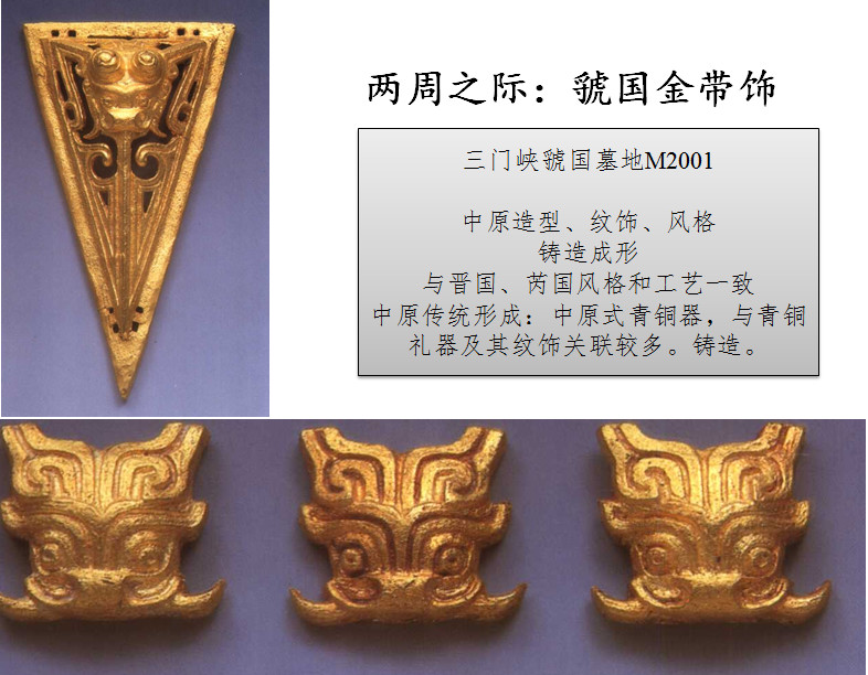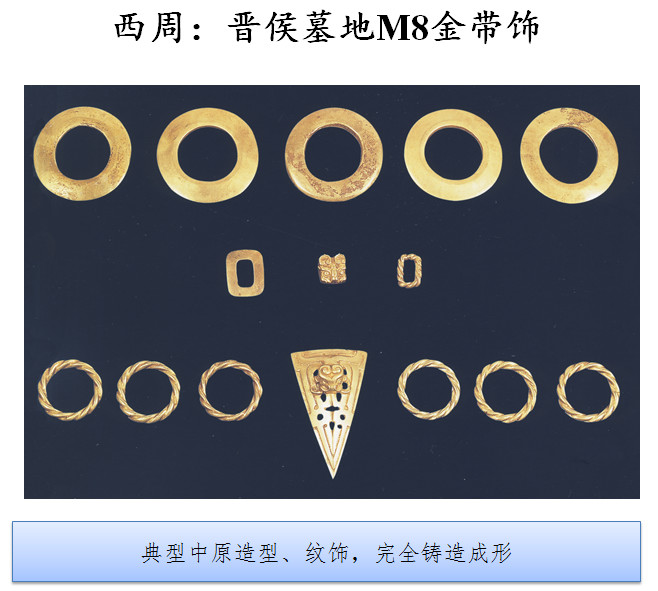 在商代晚期的山西吕梁地区,也出现了一些被认为是受草原文化影响的金饰品,锻打成形,但究竟受哪里的影响?人云亦云不少,未见深入讨论。到西周时期,临汾盆地的晋侯墓地出土了一批铸金的带饰;稍晚,两周之际的韩城梁带村芮国墓地和三门峡虢国墓地,都出土有更多的铸金首饰和装饰,构建了西周晚期到两周之际金的传统。