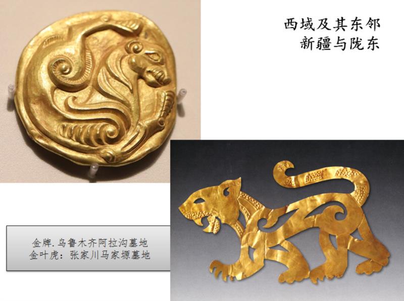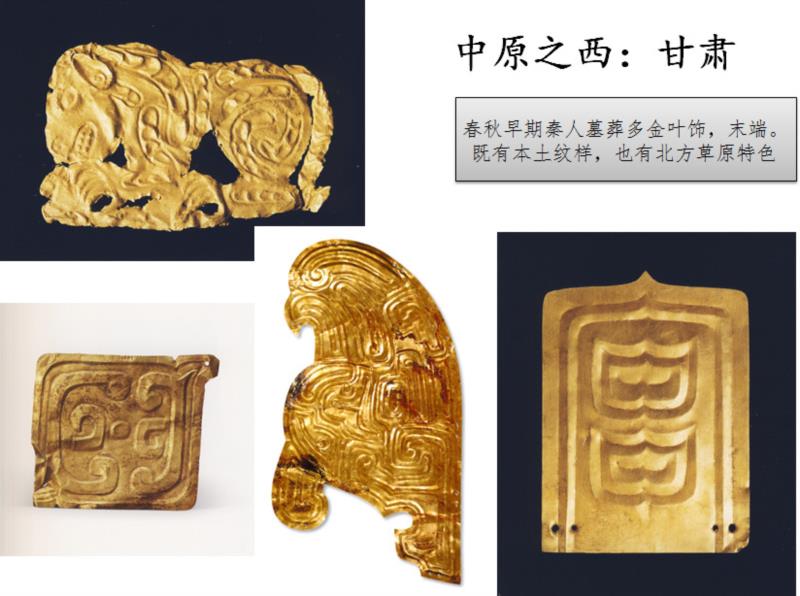 与之相对的甘肃陇东定西地区,那是秦人早期勃兴之地,礼县大堡子山秦墓中,虽然出土了大量的锻打的金叶饰,包括草原文化特色的动物造型,更多的则具有道地的中原纹样,当然,陇东是一个中原文化和草原文化的结合地带。