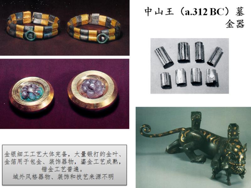 春秋晚期到战国初期,即公元前六世纪末到前四世纪,是中原青铜器另一个繁盛时代,铸、锻两种类型的金器广有出土,但如战国早期的曾侯墓的金器,几乎全部是铸造成形的,说明中原传统依然具有支配力量。更大的变革大概发生在公元前四世纪晚期,如战国中山王墓的金器,常与银合构,金也与银同饰,有锻造金片卷成金管,也有铸造的金鐏,既有金叶和金箔包贴的铜泡,也有鎏金的铜器,更多金、银共错的装饰,特别是铸镶银花于金饰之中,更是将红铜铸镶移往金银器的创举。尽管这些器物的风格和文化渊源还有待探讨,但如此多样、多工艺的金银器集中在这样一个蕞尔小国墓葬,值得深入探讨。错金银和鎏金这两种工艺的渊源,都可上溯到公元前三千纪的古埃及,是否中原的工艺自那里辗转传入,也是值得探讨的问题。
