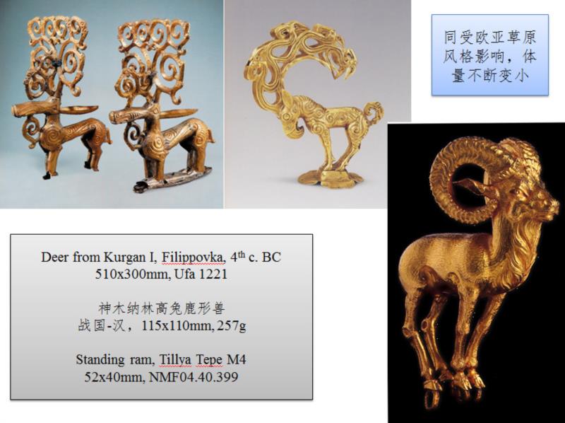 很明显,通常所说的丝绸之路,以帕米尔高原为界,西边是一个体系,西域是一个体系,而中原是另一个体系,西域连接东和西。考察处在十字路口的阿富汗金器,可以发现自西向东的现象。以大角鹿形金器而言,彼得堡西米塔什博物馆收藏的出自Filippovka的年代最早,约公元前四世纪。阿富汗所出一件在公元一世纪。而鄂尔多斯高原神木纳林高兔墓出土的一件,年代可到公元前三世纪。若划传播的路线,黑海到鄂尔多斯一条属草原之路,而到喀布尔的一条,属于丝绸之路西段,二者平行,鄂尔多斯与喀布尔未必有交集。