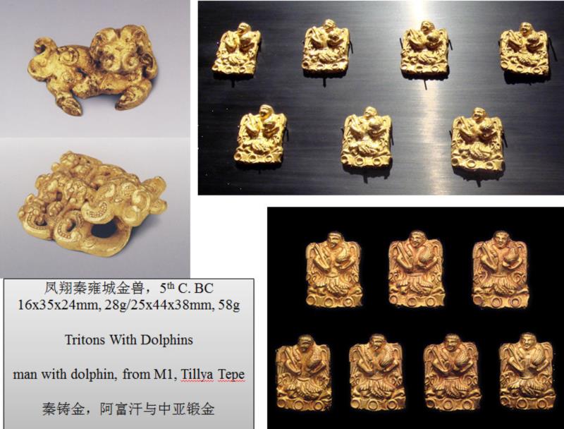 关于阿富汗蒂拉丘地一号墓出土的金人形饰和小金兽,年代在公元一世纪,同样类型的金制品,在俄罗斯南部也有发现,年代要早数百年,但都是锻造制品。凤翔秦雍城出土的公元前五世纪的小金兽,却是铸造的。说明阿富汗的金器,渊源在中亚和近东,中原对其几乎没有影响。