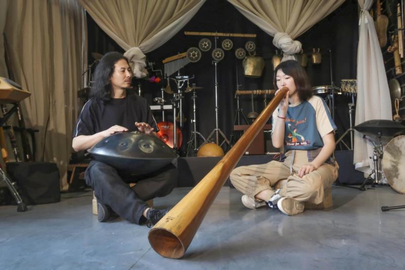 石磊(左)与王萌莹(右)正在演奏手碟和迪吉里杜管