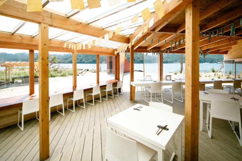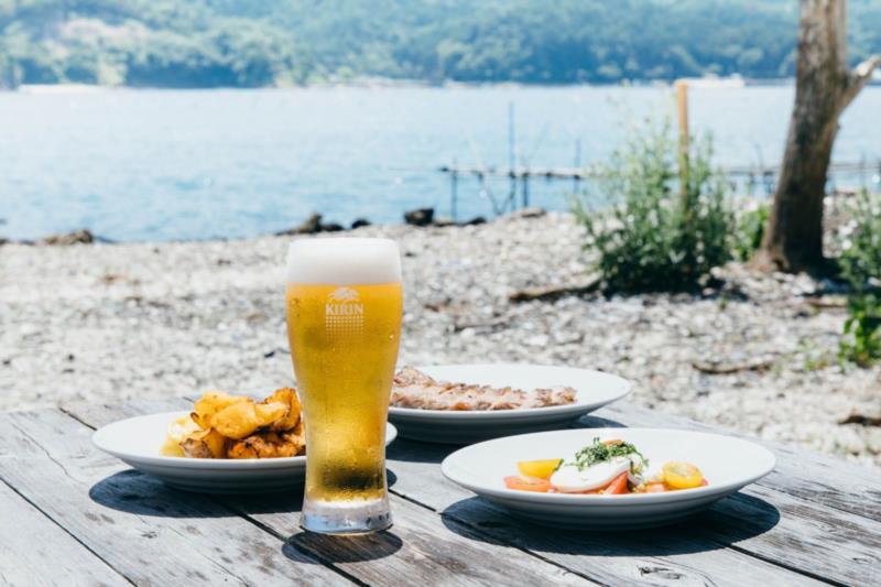 在即将成为日本著名打卡地的名和晃平作品“White Deer”前,面临着一片全是牡蛎壳的海滩,在重生艺术节期间限定开放的Reborn-Art Dining餐厅,可以享受一杯麒麟啤酒。