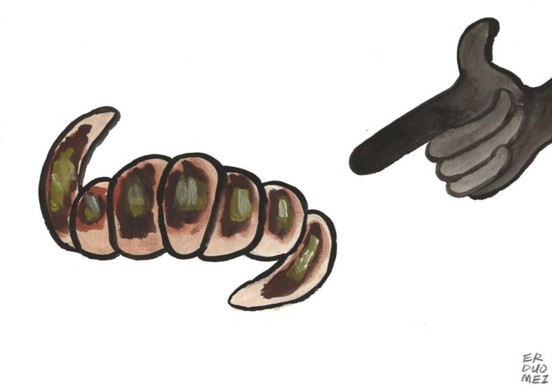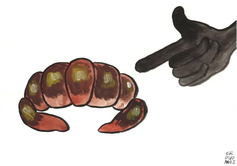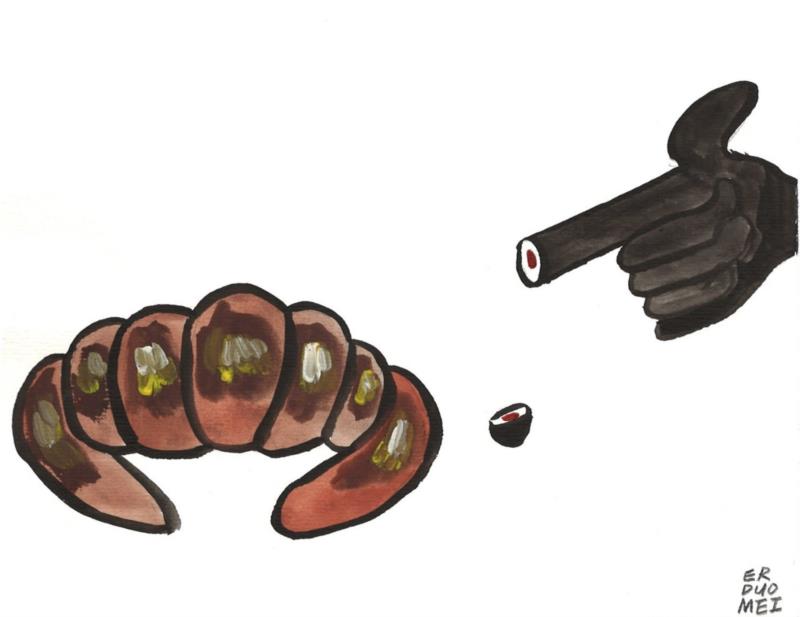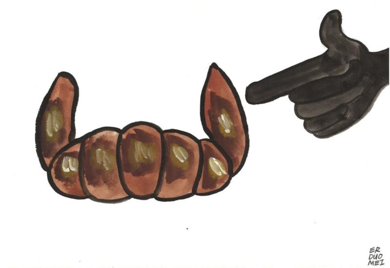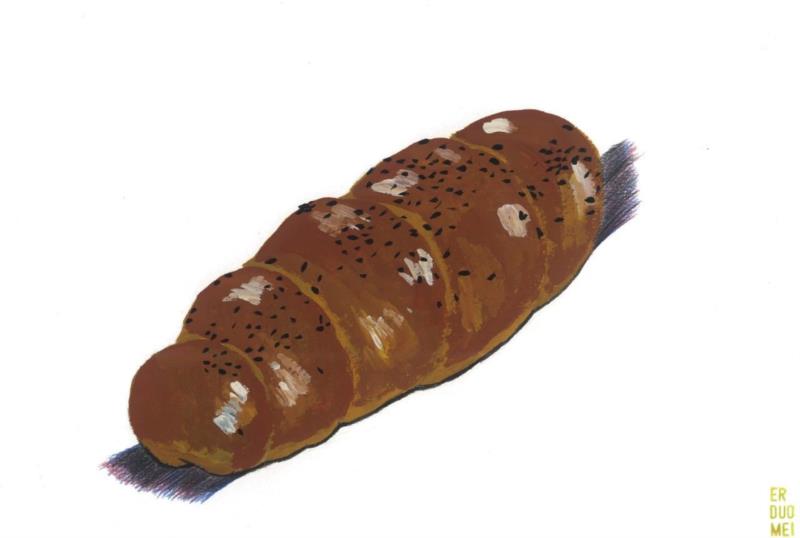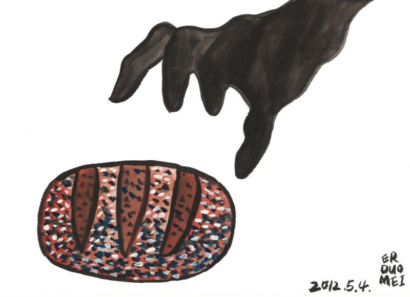 “面包是人类基于想吃肉的一个转换,面包之所以做成这样的颜色,是因为要模仿肉的视觉质感,来提高人的食欲,不然,面粉有什么好吃的?面包是另一种素鸡、素烧鹅,所以在普通的面包外表下隐藏着暴力和原始的欲望。”