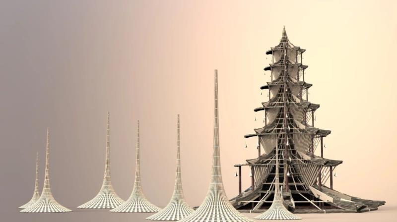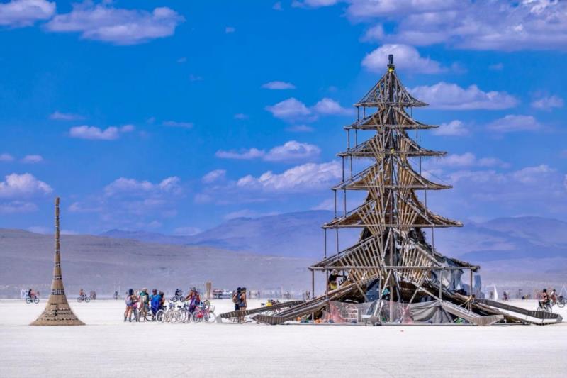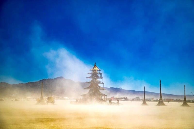 在今年的火人节上有一个来自中国团队的作品:“幻 TULPAASHRAMS”,它由八座错落有序的塔群方阵组成,包括一个主塔和七个直刺天空的锥型塔。它是由六位艺术家,根据今年火人节主题“METAMORPHOSES”,共同创作出的一座凝练过去与未来、结合东方与西方表达元素的艺术装置。