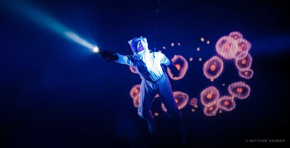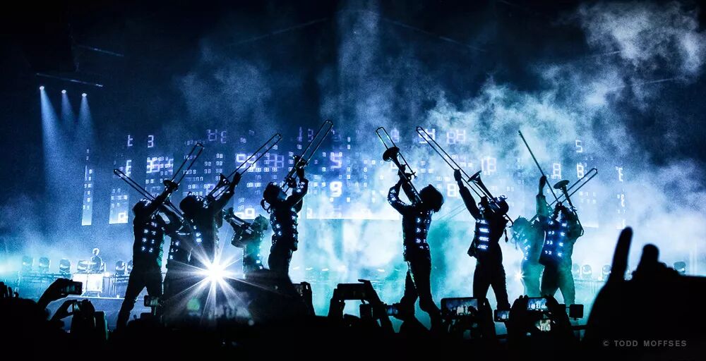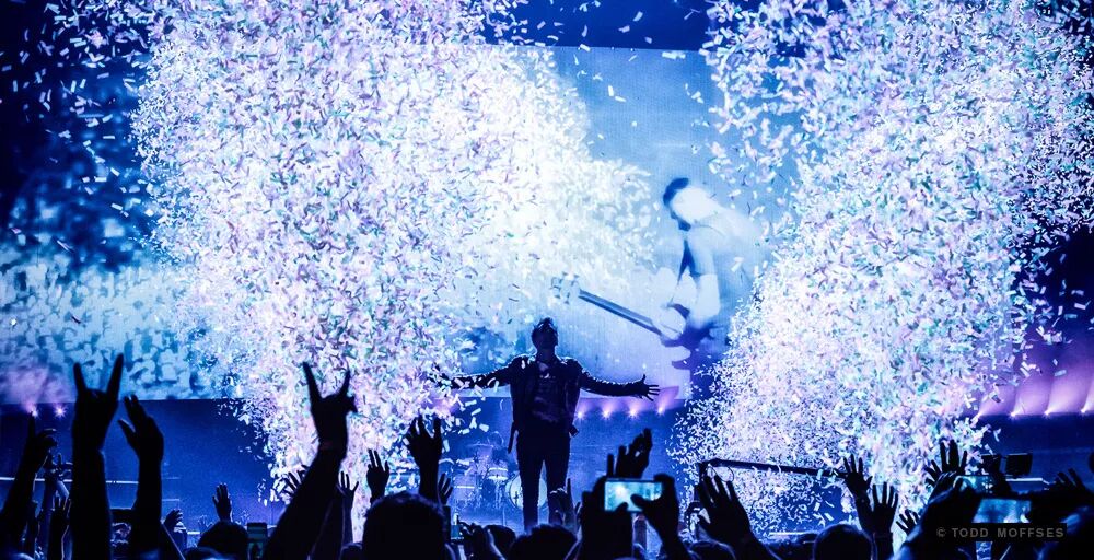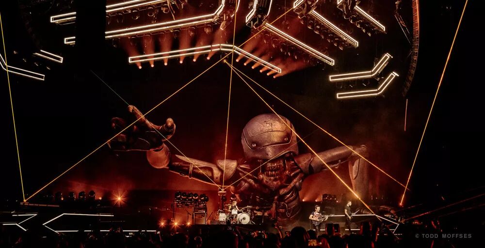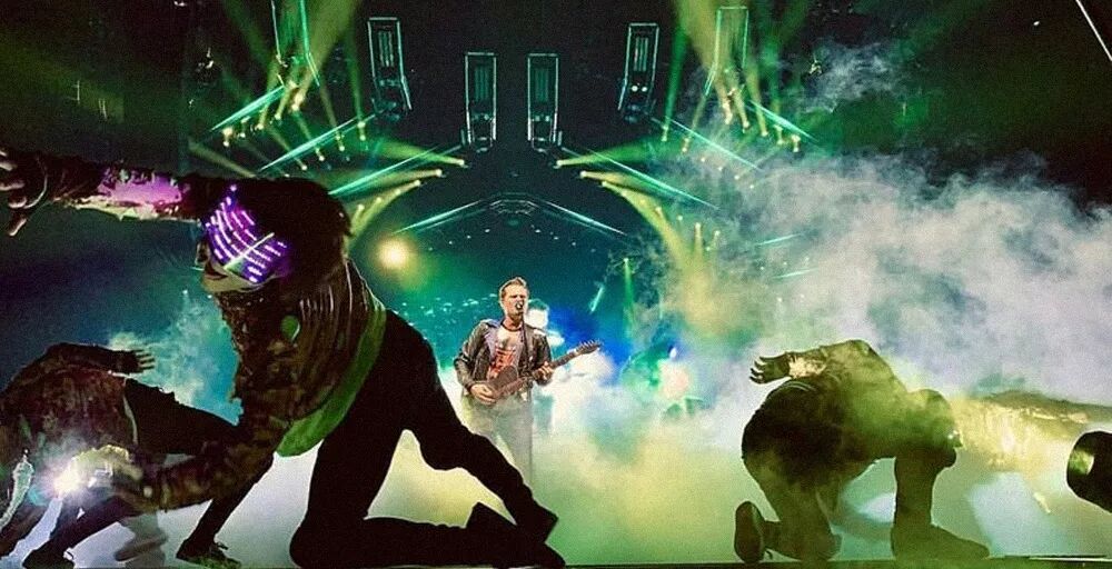 视觉设计绝对是这个演唱会的一个“爆点”,为了能够产生具有电影效果的效果感觉,现场采用Notch进行实时创作,现场还采用了增强现实技术,例如,你可以在屏幕中看到马修手中的头骨着火,而在舞台上,它仍然只是一个头骨。