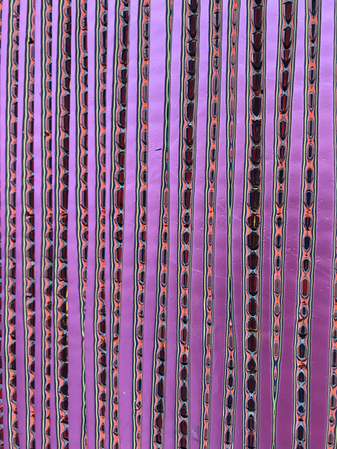 如果仔细观察,我们能够辨识艺术家嵌入“珍珠”系列作品的若隐若现的层次。展览现场的观众在水平方向移动的过程中,更容易感受到画面竖刻线条的色彩变化。光学节奏激活了原本平坦的二维空间,从而在画面创造运动。肌理为观看带来的互动关系并未停留在表面,而是打开具有延展性的空间。“珍珠”系列隐约可见的横向分割层是由垂直方向往内部刻的并排线条产生的,鞠婷进而希望画面空间能够向外部延伸,便将刻至一半的线条外翻并搭靠于表面。“+-”系列由此在作品中部构成一条明显的分界线,提示正负空间之间的相互转化。
