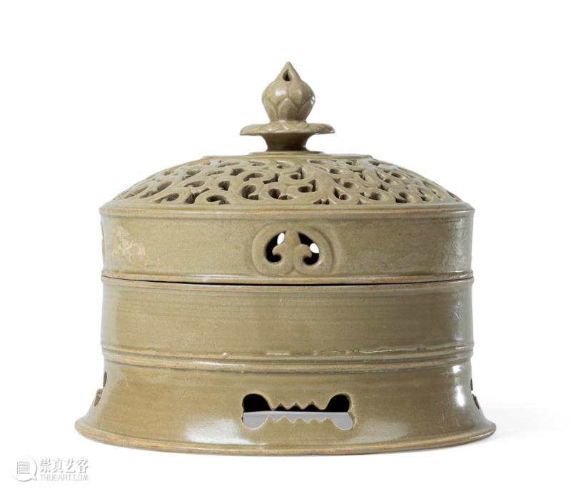 五代·越窑青釉镂雕卷草纹宝珠纽带盖香薰