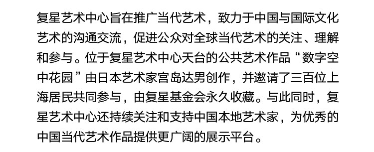 复星自成立以来,秉承“修身、齐家、立业、助天下”的理念,深入践行企业社会责任,坚持服务社会、服务人民、服务国家。复星艺术中心成立于2012年11月,是以复星为主要捐赠人的公益行为体。复星基金会的从事业务包括:自然灾害救助、扶贫助残、资助文化公益事业、资助教育公益事业、资助青年创业就业及其他社会公益事业。这些年来,复星基金会以教育和文化为两个主要方向,每年捐助公益项目40余个,年捐助额达到4500万元。依托复星艺术中心这一最亮丽的、特有的平台,复星基金会积极打造国际化的复星艺术文化圈,引领中西方文化交流,使文化交流成为复星在海外的公益名片。通过更多与世界一流文化艺术机构的合作,把强劲的中国文化消费动力和国际一流的文化艺术品牌、服务连接起来,汇聚资源,用丰富多元的文化产品和服务满足中国客户对更美好生活的需求,打造出一个植根中国,具备全球产业整合能力的健康和快乐时尚生态圈。