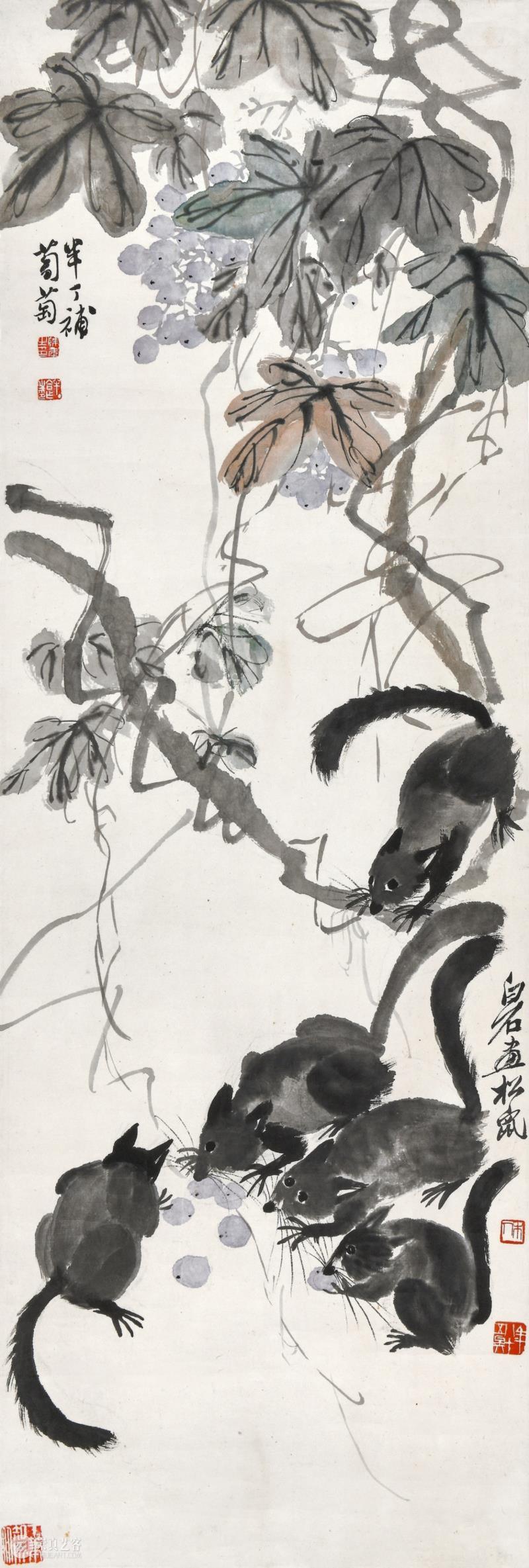 鼠也是古画中早有的题材,鼠于十二地支属“子”,有多子之意。葡萄松鼠亦是传统画题,葡萄象征丰产,正于鼠之多子相合。