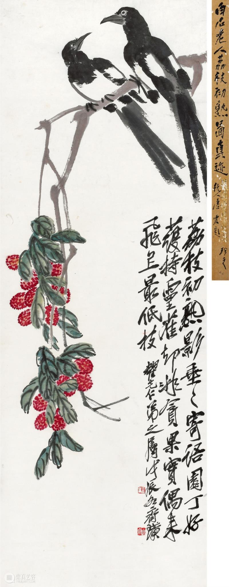 本幅:荔枝初熟影垂垂,寄语园丁好护持。灵鹊(雀)却非贪果实,偶来飞上最低枝。耀先仁弟之属,戊辰冬,齐璜。钤印:木人、白石翁