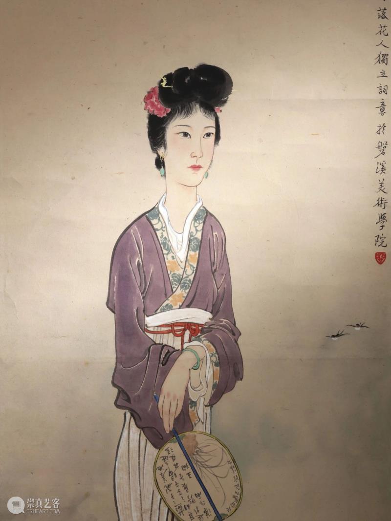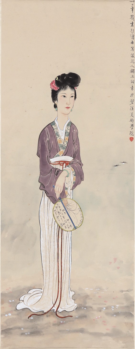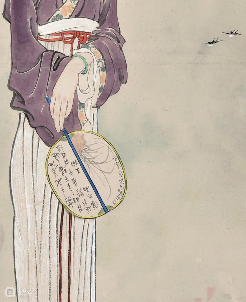 画中仕女手执一扇,扇面题有《诗经?邶风?燕燕》第一章,用燕燕双飞的自由欢畅来反衬同胞别离的哀愁苦闷,强调了作品的情绪氛围。一如有学者言:“徐悲鸿意在借诗意表达对不肯同流合污的志节的歌颂,同时也有以‘佳人’自比的成分。实际上,这与传统中国画,尤其是花鸟画,如四君子题材,借物托志、寄情、抒怀等等,在本质上是一样的,只是文人常常喜欢以竹或兰自比,而很少以仕女自比;而且在以仕女为主要表现对象的诗意画中,也以诠释种种美丽和思念之情为主,少有用仕女寄托清高气节的。这些都应看作徐悲鸿的改良内容之一。”(节选自《徐悲鸿的中国画改良》,华天雪著,上海书画出版社。)