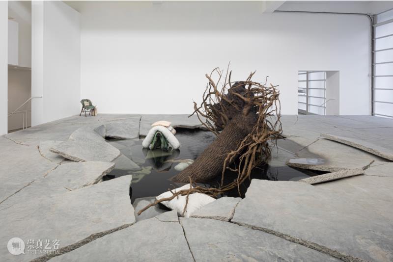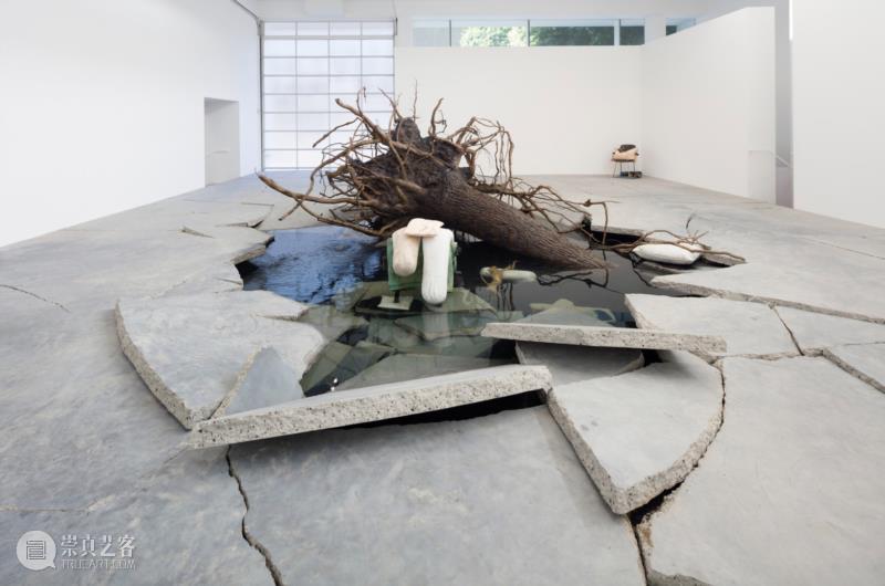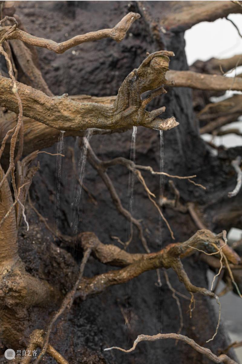 在作品《萨满》(The Shaman,2018)中,艺术家进一步研究了树的启示力量。此作品中有一棵青铜铸成的橡树,部分浸在破裂的混凝土地面下的一池水中。水从浑浊的树根和一堆用大理石、花岗岩和玛瑙雕刻而成的软垫中缓缓流出,汇聚在池水中,引发了人们对破坏的原因和后果的疑问。