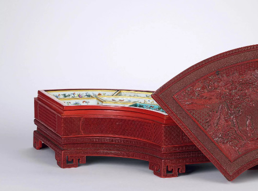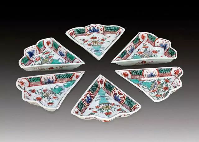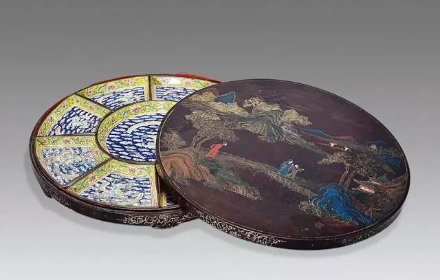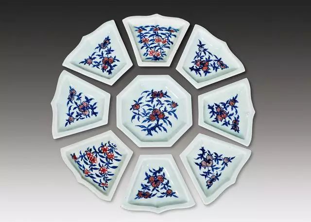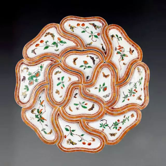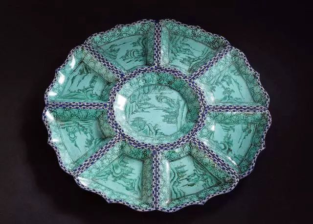 清 外蓝釉内绿釉绘山水楼阁紫砂九子攒盘