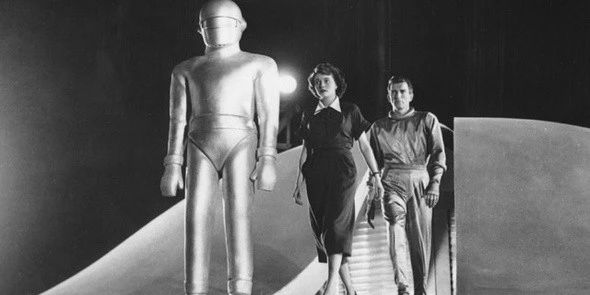 《大都会》创造了一个记录——史上最昂贵默片,人数最多的一场戏用了3万名群演。以现代货币计算的话,这部花费两年时间制作完成的片子花了大概14亿人民币,最后直接把制片人搞到破产。故事背景设置在一个未来主义的反乌托邦城市中,讲述了城主富有的儿子弗雷德与工人玛丽亚为克服巨大的阶级鸿沟所作的努力,如此这般立意使这部距今近百年的科幻电影成为了永恒。不仅如此,微缩模型和摄影技巧构建起庞大的工业化城市景观,矗立在荧幕上的巨大哥特式建筑使得这部片子具有强烈的装饰主义色彩——毕竟是魏玛时期德国出品。二战后的数年时间被称为科幻电影的黄金时代,也是在那段时间里,科幻电影才真正成为了一种明确的电影类型。彼时,发生在广岛的人间悲剧让全人类对核浩劫心生恐惧,冷战的爆发也让电影人开始重新思考人类自身与世界的关系。相较于默片时代的作品,这一时期的科幻片有三个明显特征:1、文学改编作品的比例大幅降低;2、思考深度与广度得到进一步拓宽;3、自然是声音与色彩的出现。The Day the Earth Stood Still (1951)