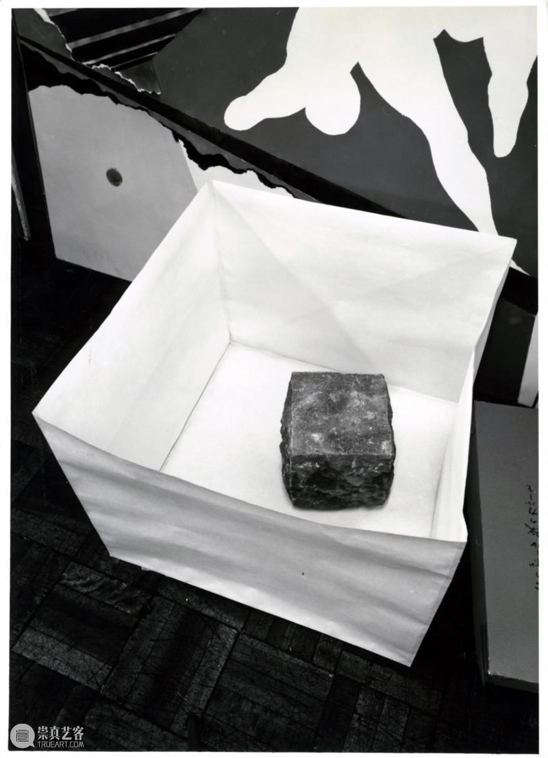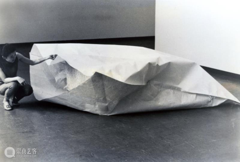 1969年的《纸》系列作品是代表作,用纸包裹巨大的石头。是有两个作品,一个的两吨的石头,另一个是一百公斤。关于两吨的这个作品,是因为偶然有了一个1.5m×1.5m×50cm石头,本来是想拿来做其他的作品的,后来想想做了这件作品。为什么要做这么大,是因为在日常生活里谁都不会觉得自己可以拿得起这个石头。猜一猜最大的两吨的石头作品是怎样做出来的,其实是底下放一层纸,上面再放一层纸,然后把它们缝起来,就是这么完成的。