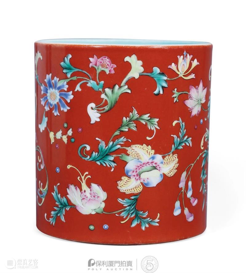 清乾隆 珊瑚红地洋彩花卉纹笔筒