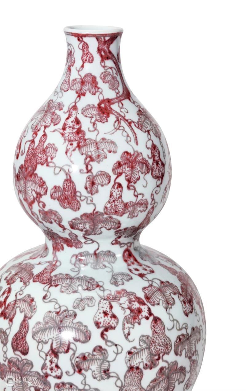 本品葫芦式样,外壁通体以釉里红作装饰。外壁通体釉里红葫芦纹装饰,发色纯正妍丽,有深浅色阶,纹饰新颖,其枝蔓疏朗有致,纹饰饱满清晰,画工殊为精妙,布局之妙,独见匠心。
