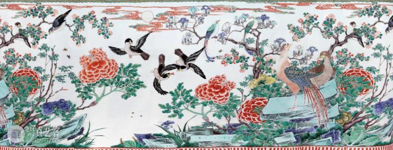腹部主体绘玉堂富贵图为主题,芭蕉松石、翠竹海棠,锦鸡牡丹、玉兰喜鹊,树梢上旭日初升,红云高照,富丽华贵,寓意吉祥。其中,以百子图寓意「多子多福」,而用兰花象征玉堂,牡丹花象征富贵,这两种花卉图借喻玉堂富贵,祝愿职位高升,富裕显贵。整器体型硕大,气势雄浑,尤为惊人,纹饰运笔大气流畅,精工古雅,色彩古拙厚重,艳而不俗,颇具康熙瓷画精髓,堪称清代康熙五彩精品,殊世罕见。