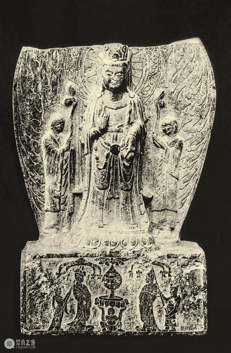 菩萨站在莲座上,旁边是两个手持莲花的比丘。叶形大背光只有下部保留下来,边缘装饰着火焰纹。高基座上是浅浮雕,一个蹲着的童子托举起一个香炉,香炉两侧站着一男一女两个供养人以及他们的仆人。