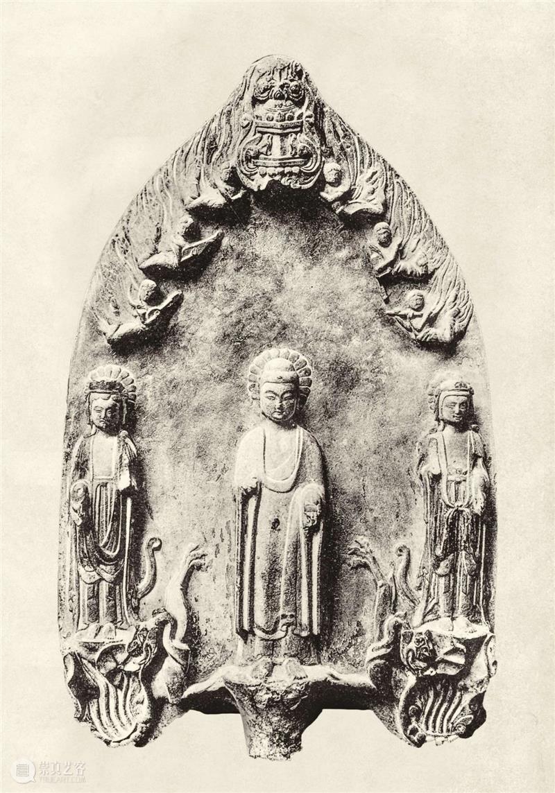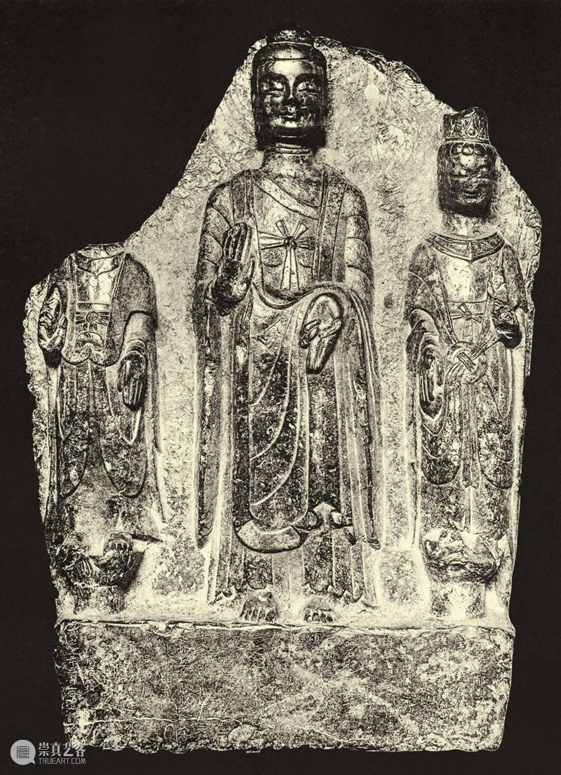 释迦牟尼立像,右手施无畏印。两旁各有一尊站在莲座上的菩萨,右侧菩萨的头部缺失,背光上部破损。