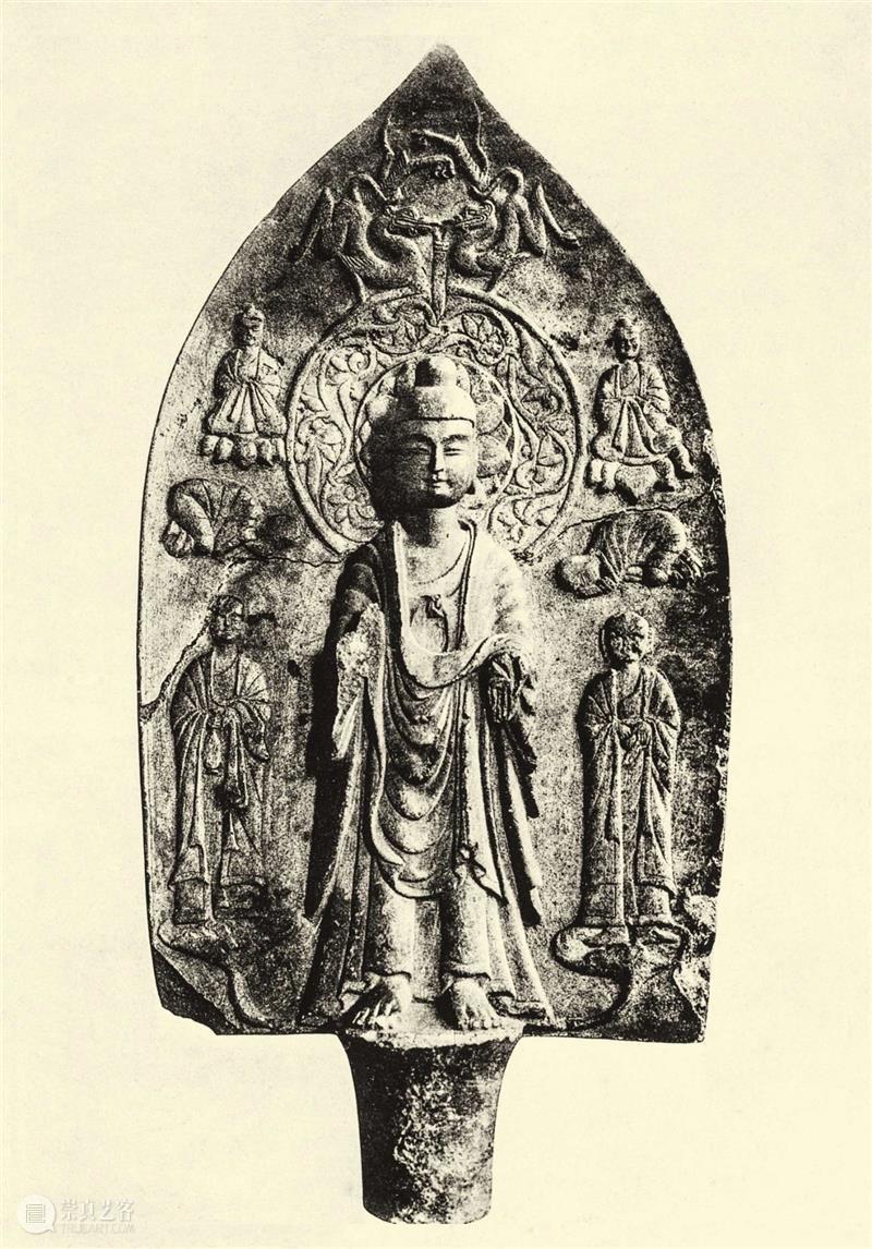 释迦牟尼立像,右手(部分已毁坏)举起,施无畏印,左手放低,结与愿印。他的旁边有两个浅浮雕比丘,可能是佛的弟子。上方还有两个拜倒在地上的比丘,再往上是两尊坐在莲座上的佛,顶部有两个飞起的那伽。背光装饰着缠枝花纹。这座石碑来自山东曲阜,材质是一种硬质灰色石料,在其他的山东雕塑中也可以见到。