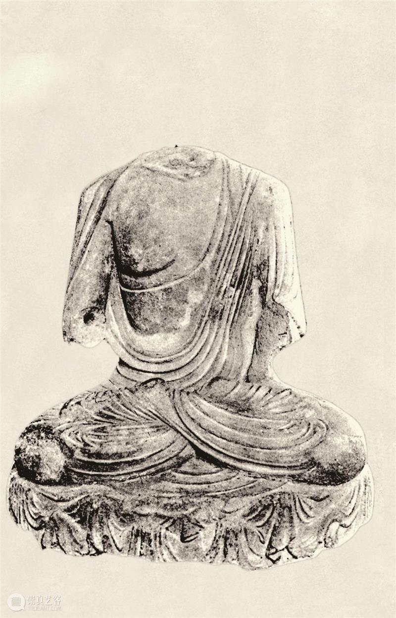 结跏趺坐于圆形基座上,双手和头部缺失。着右袒式袈裟,前胸大部分袒露,腿脚完全被遮盖。